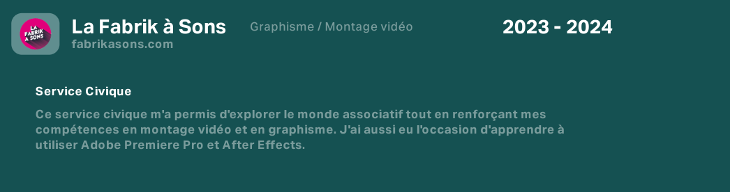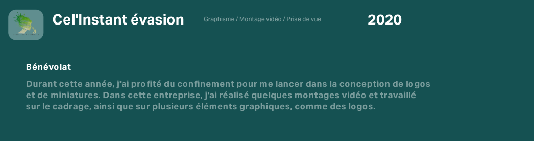 acquérir des compétences dans les domaines que je préfère (Montage vidéo, Graphisme…), grâce à ce service civique j’ai également pu développer mon portfolio.